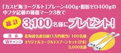 - 「カスピ海ヨーグルトプレーン400g、カスピ海ヨーグルト脂肪ゼロ400g」についている応募券3枚で応募